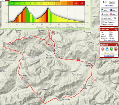 Zembrzyce-Sucha-Jasień-Bace-Koźle-Żmije. Potem fotki przy skałkach na Żurawnicy, zjazd zielonym do Krzeszowa a stamtąd do Stryszawy (rekord prędkości 70 km/h).Ze Stryszawy na Przysłop, a stamtąd do Zawoi serpentynami i powrót do Zembrzyc.